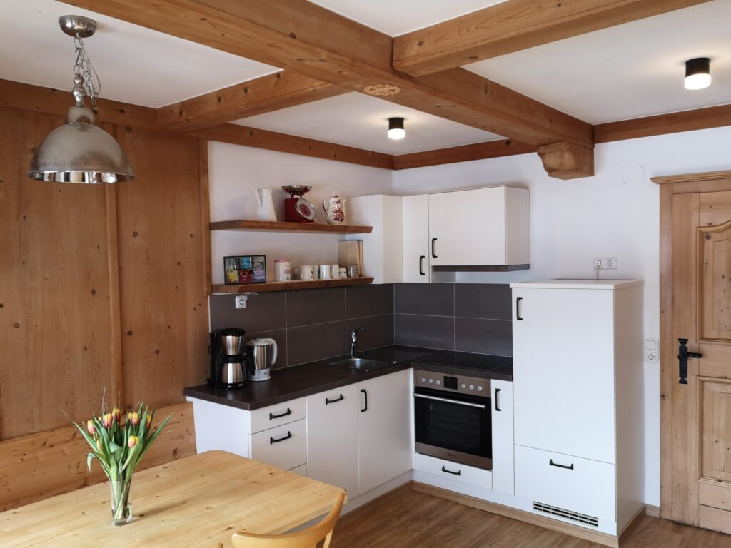 • Küche mit Backofen/Herd, Kühlschrank, Geschirrspüler, Kaffeemaschine, Wasserkocher, Toaster; Koch‑Basics
